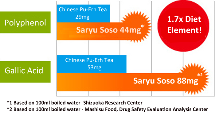 Japanese Diet Pu-Erh Tea - Saryu Soso is a national award-winning tea, good for diets and skin. Tea is extremely popular in Japan because of its benefits. Saryu Soso contains 1.7 times the tannic acid (a subset of Polyphenol, made up by Gallic Acid) compared to Chinese Pu-Erh tea.