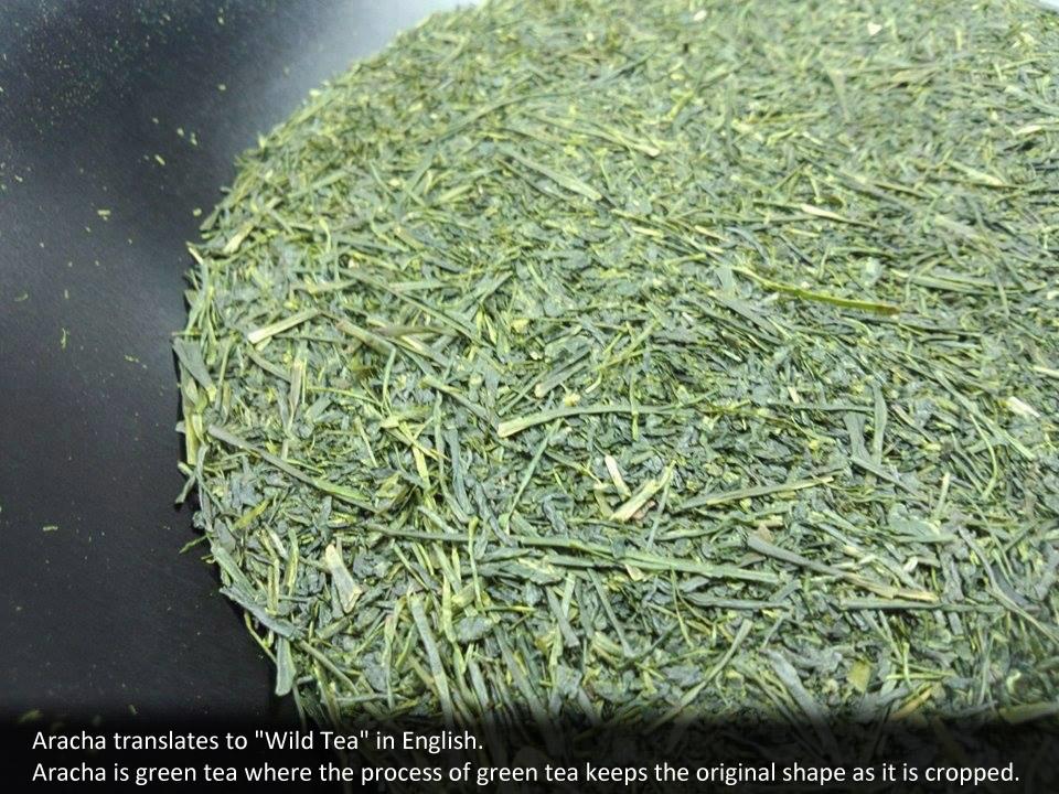 “Aracha” translates to "Wild Tea" in English, and is also known as crude tea. Aracha is green tea where the process keeps the original shape as it is cropped whereas most green teas that are consumed are refined and processed. In Japan, green tea is usually sold from the farmer to a wholesaler where it gets processed and refined. When the tea is provided to the wholesaler, the form of it is usually the unprocessed Aracha; this type of green tea is normally not distributed to consumers. However, due to being able to enjoy rich and natural taste and flavors, some fans prefer drinking this type.